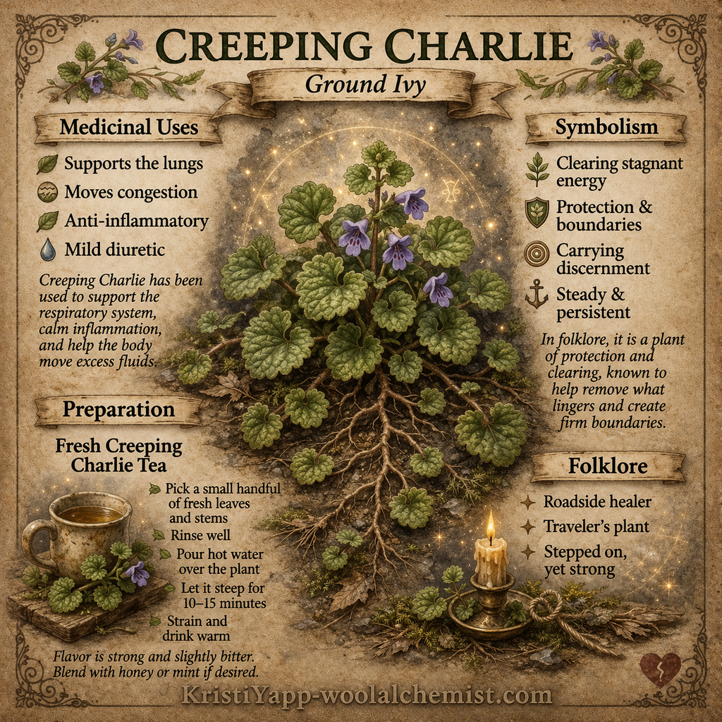Creeping Charlie, also called Ground Ivy, has been used for generations as a working herb. It is part of the mint family, and like many plants in that family, it carries both strength and function.