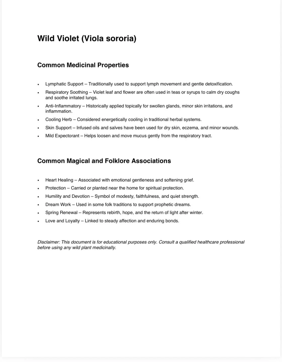 Every part of the violet is edible and rich in vitamins. In early spring, I add the tender leaves and blossoms to salads and keep fresh violet tea steeping on the stove. Traditionally, violet is known for its gentle anti-inflammatory and soothing qualities, and in folklore it is associated with heart healing, protection, and vivid dreams.