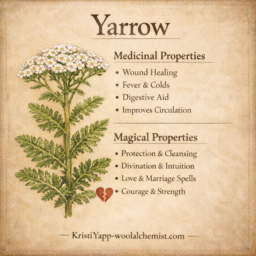 For centuries Yarrow has been known as a healer’s plant. It was carried by travelers and warriors for protection and used to treat wounds in the field. In folk magic it is associated with courage, protection, and strengthening the spirit.