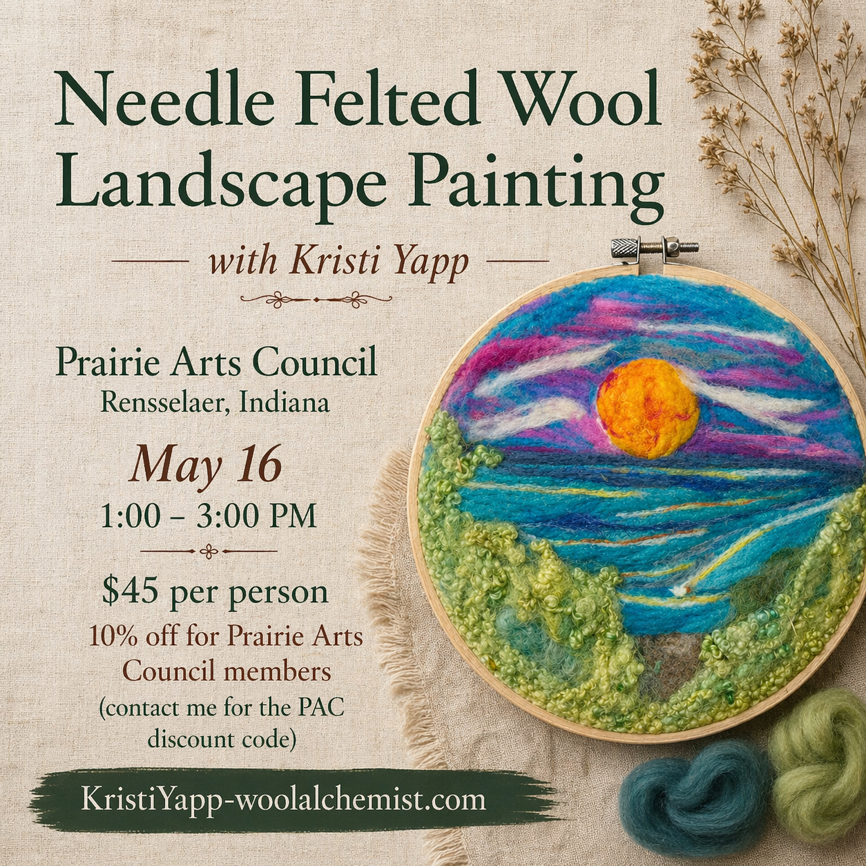 Join fiber artist Kristi Yapp at Prairie Arts Council in Rensselaer for a hands-on Needle Felted Wool Landscape Painting workshop. In this beginner friendly class, you will learn the fundamentals of needle felting as you build an 8 inch wool landscape step by step. Using a barbed felting needle and layers of wool, you will shape color, texture, and depth into a finished piece that reflects your own vision. All materials are provided, and no prior experience is required.